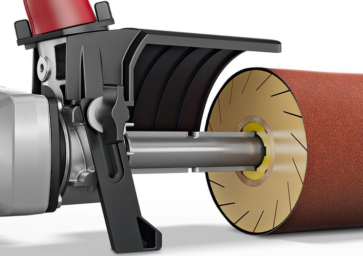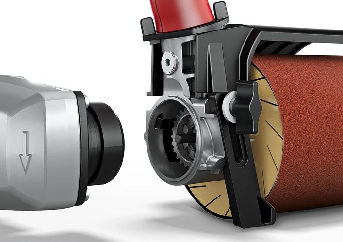 - Adaptateur de satinage à réglage variable, permet un travail près du bord, convient aussi pour les rouleaux étroits, butée parallèle incluse. Changement d’outil de ponçage sans outil grâce au système breveté de changement rapide